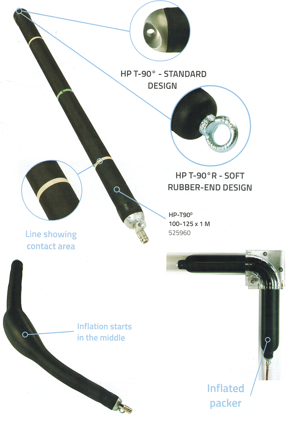 Den unike konstruksjonen og gummi egenskapen til Sava-pakkere HP-T90° tillater effektive reparasjoner av rørbøyninger på 45, 60 og 90°. De harde delene av Sava T-packers HP-90 ° er laget så kort som mulig for å lette innføringen og trekke packer gjennom rørlednings bender.